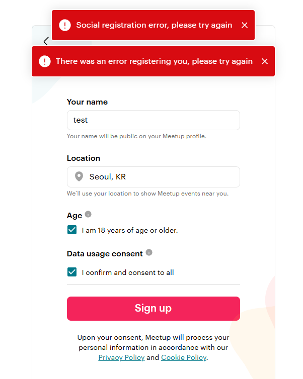 세미나 참석을 위해서 meetup 회원가입을 시도 하는데 위와 같은 에러 발생하고있었다.
